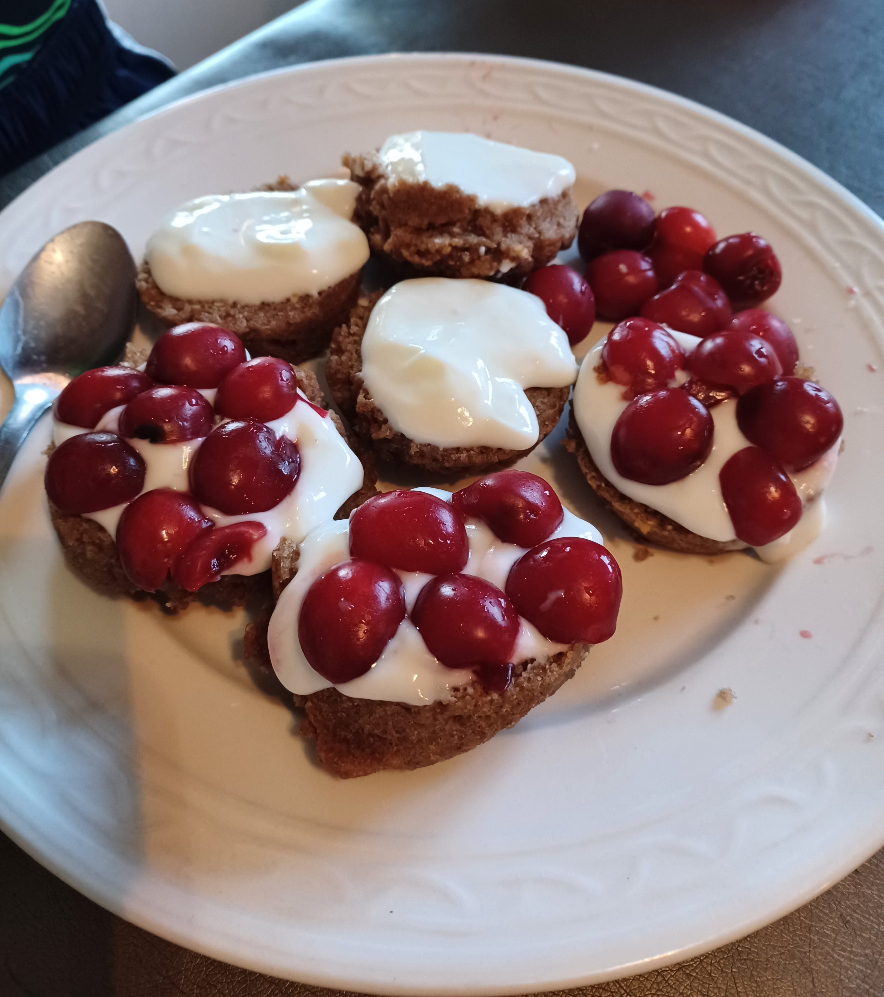 Eat cherries. Freeze cherries for that crystallized tangy crunch. Make and eat cherry hand pies using an egg-heavy bread dough. (Primary production, reward, household, synergy (with baking))